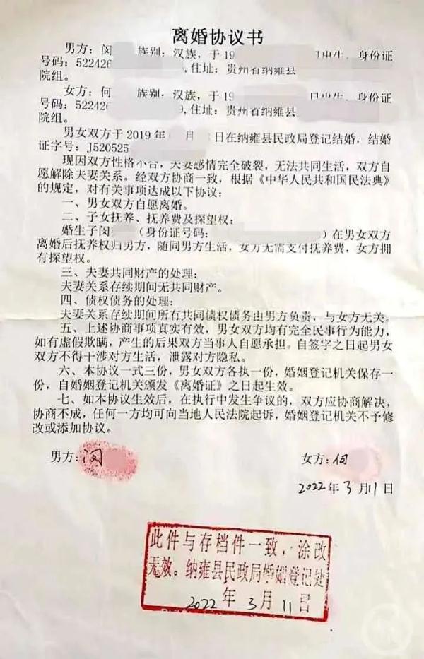 两个月后的2022年3月11日,闵某向妻子提出离婚。据两人在纳雍县民政局签订的离婚协议显示,双方自愿解除夫妻关系;婚生子抚养权归男方,随同男方生活,女方无需支付抚养费,且拥有探望权;两人夫妻关系存续期间无共同财产,所有共同债权债务由男方负责,与女方无关。协议还确认,如本协议生效后,在执行中发生争议的,双方应协商解决,协商不成,任何一方均可向当地人民法院起诉,婚姻登记机关不予修改或添加协议。